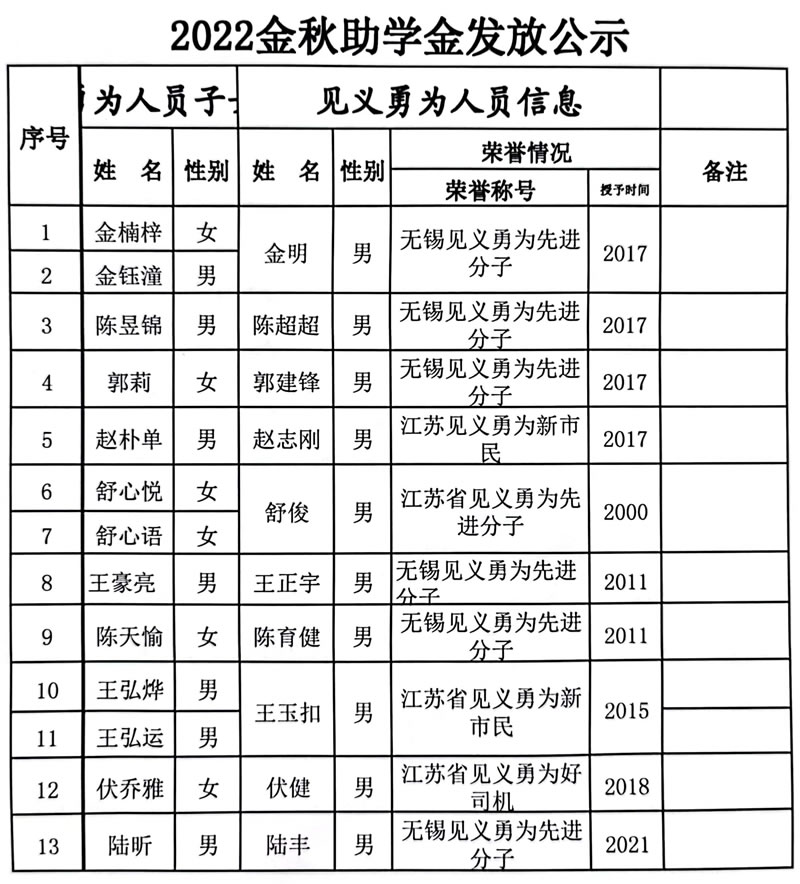 为了进一步关心关爱困难见义勇为人员和助力乡村振兴,宜兴市见义勇为基金会拟对家庭困难见义勇为人员在读子女进行助学资助,现将本年度金秋助学金发放进行公示(详情见附件)。